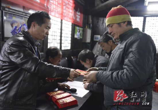 红网靖州站2月5日讯(通讯员 龙本亮 李丽 杨昌朝) “第一次拿到旅游开发红包,非常非常的高兴!不搞苗寨开发我们根本就拿不到分红,希望以后地笋能搞得越来越好,游客越来越多!”地笋村民吴展坤拿着红包高兴地对记者说。2月3日对于地笋苗寨的村民来说,是一个值得高兴的日子。全村128户村民都收到了一个“红包”,这是地笋村给村民们分发的2014年的旅游红利。