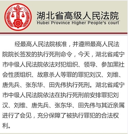 经最高人民法院核准,并遵照最高人民法院院长签发的执行死刑命令,今天,湖北省咸宁市中级人民法院依法对犯组织、领导、参加黑社会性质组织、故意杀人等罪的罪犯刘汉、刘维、唐先兵、张东华、田先伟执行死刑。湖北省咸宁市中级人民法院依法在执行死刑前安排罪犯刘汉、刘维、唐先兵、张东华、田先伟与其近亲属进行了会见,充分保障了被执行罪犯的合法权利。