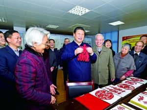 15日上午,习近平在西安市雁塔区电子城街道二 五所社区服务中心,拿起一幅“三阳开泰”剪纸,祝愿全国各族人民新春愉快、羊年大吉,生活喜气洋洋,事业蒸蒸日上。 新华社记者 李学仁/摄
