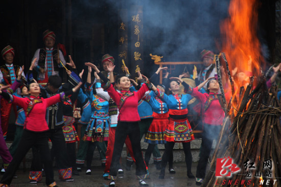 渐渐地,喧闹、火光……把浓浓的情意,如火的热情释放出来。围观的人们整个摆手堂变成了歌舞的海洋。