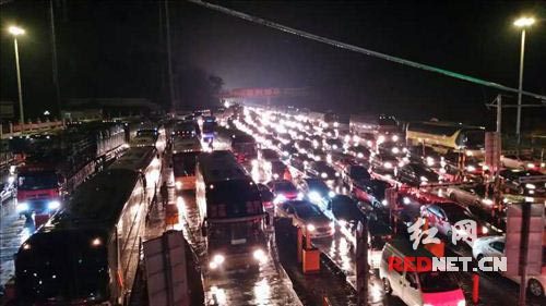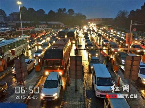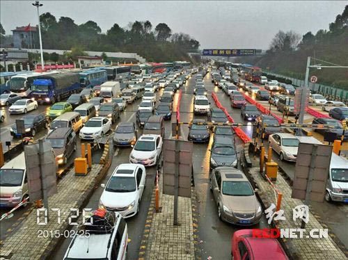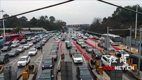 因为106国道上路还没修好,高速车流在原有基础上巨增,再加上25号免费通行已经结束,过往的车辆不能快速通过,就导致了卡口通行缓慢。