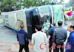广州日报肇庆讯 (记者于敢勇 通讯员申莹摄影报道) 昨日上午,321国道肇庆鼎湖莲花镇古遗路段发生一起大客车侧翻的事故,事故造成1人死亡、1人受伤、8人受轻微伤。