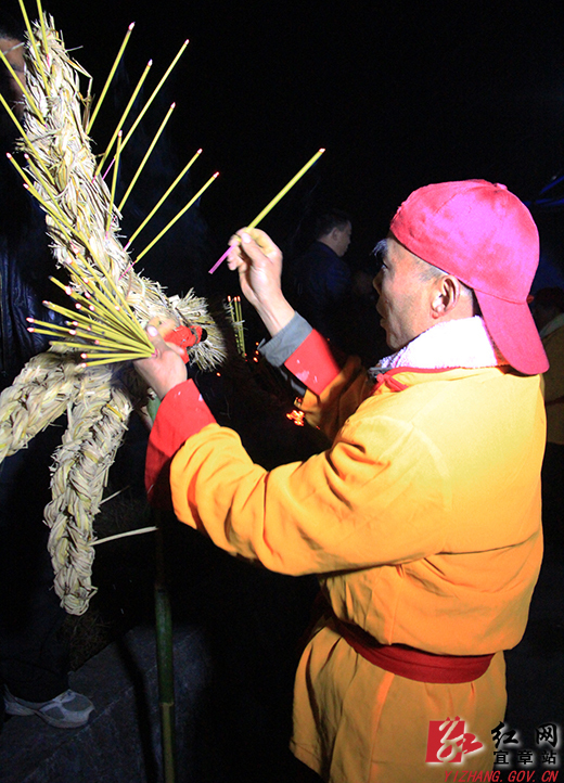 香火龙队也加紧了准备时间。用稻草扎制龙头、龙身、龙尾,将整条龙用草绳连接成龙形线条,在龙身插上足足千余根香,点燃香火,整个过程一点都不马虎。该乡香火龙队第七代传人刘继东说,舞香火龙这项传统技艺是代代相传,龙意味着吉祥,火昭示着兴旺,插于龙脉上的香越多,象征着越吉祥。
