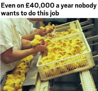 大概一天要看800-1200只小鸡的屁屁鉴定他们的性别。年薪4万英镑(约合人民币38万元),目前英国没人愿意去干这行。敢问阁下,你能忍受成年累月的看鸡屁屁么?