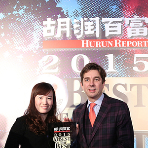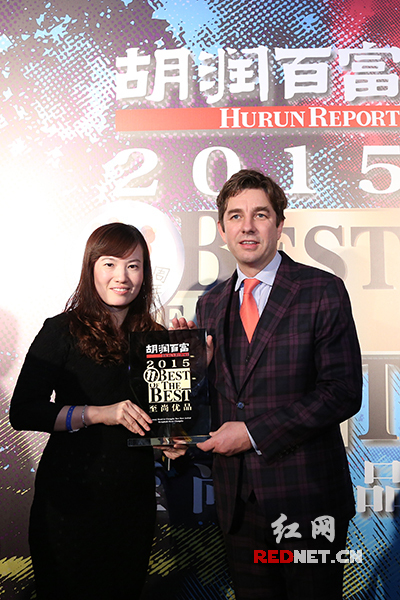 (李倩与胡润先生合影。2015年李倩赴上海代表长沙顺天凯宾斯基酒店领取《胡润百富》至尚优品奢华酒店最佳新秀奖。)