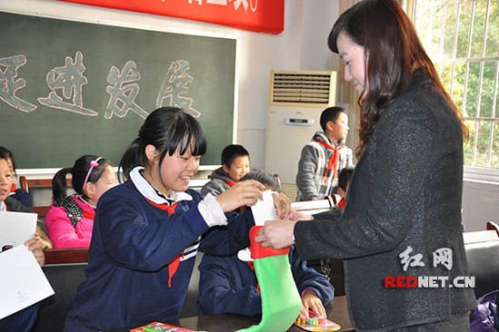 (2014年圣诞节,李倩代表长沙顺天凯宾斯基酒店为圭塘小学的20名农民工子弟送上圣诞心愿。)