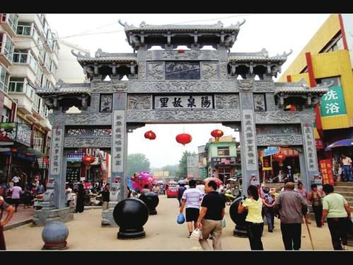 古村的主街是阳泉街,垂直于主街的牌楼巷、南支街兰家巷和上巷组成该村的交通网络体系。从东阁至西阁是主街,为古时商业一条街。以大庙戏台小广场为中心,东西对称分布有方形街和东西两棵千年古槐。石街两旁是典型的清代建筑,比肩接踵,一色的砖木结构,从破损的砖雕、木雕点缀的门面上依稀还能辨认出“大宁堂”“致和成”“广泰昌”“永庆成”“天合成”等字样,这是当时南商北贾在此开设的铺面商号,现在则变成了一户户前堂后宅的农家院落。