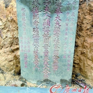 记者注意到,碑文还曾被红漆描过,可惜并不齐全。“露出的半截墓碑足足有1.5米高,从碑体大小来看,墓穴应该不小,古墓主人的身份也十分显赫。”余国祥由碑文判断,此墓为周母黄氏家族墓。年份只有“……六年歲庚辰八月十二日辰时安墓”的字样。