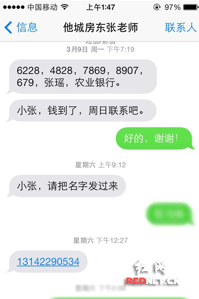 (短信记录显示,3月9日晚上,张琦通过网上银行向“房东”交押金)