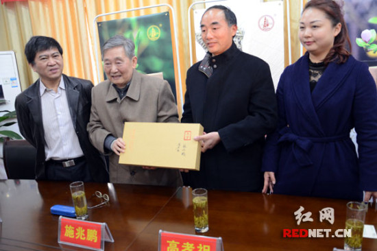 (湖南农业大学园艺学博士后流动站专家组组长施兆鹏(左二)和中国非物质文化遗产第三代黄茶大师高孝祖(右二)在顶级君山银针上签名并展示)