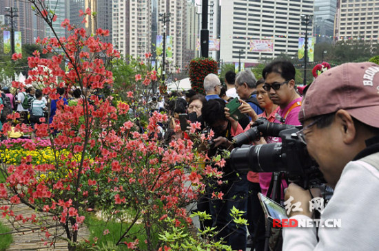 (花卉作品里面的映山红吸引众多游客拍照。)