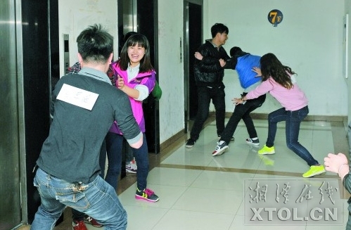3月29日下午,12个年轻人后背上都贴着写有各自姓名的名牌在楼道里“撕”杀。