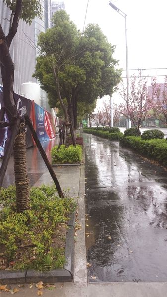 在奥体附近的庐山路、黄山路、恒山路、新安江街等马路上,记者看到,道路两旁种植着香樟树,树木并不高大,显然种植的时间还不长,也有一些像是移植过来的大树。而在地上,果真散落着许多叶片,叶片比较细长,带着点黄红色。由于天气的原因,路上并没有看到捡拾树叶的人。