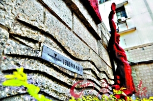 省水文局里竖立的1915年洪水纪念碑上记录的当年洪水水位线。广州日报记者何波 摄