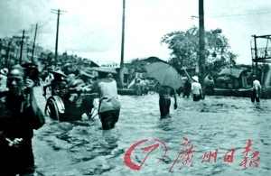 珠三角多城遭遇重创,省城广州也难逃浩劫。史料记载,7月12日起,广州有的街头水浸至近4米,长堤、西濠口、下西关、泮塘、澳口、东堤、花地等低处地区受灾尤为严重。水浸持续7天,不少居民爬到树上躲避,有的家长怕孩子脱手落水,用绳子把孩子绑在树上。西关一带水深丈余,钱村居民被洪水围困,远处只见屋脊。泮塘房屋被冲塌过半,人员死亡数百。