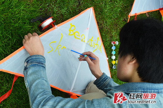 游客在风筝上写上心愿祝福