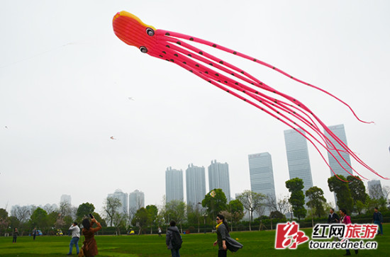 红网长沙4月4日讯(时刻新闻记者 杨烊 通讯员 海艳)“呀!快看,天上有只好大的‘八爪鱼’!”今日,一只长达40米的红色“大章鱼”翱翔在长沙橘子洲上空,长须飘飘,赚足眼球。