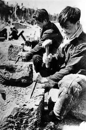 修建红旗渠的石匠(资料照片)。