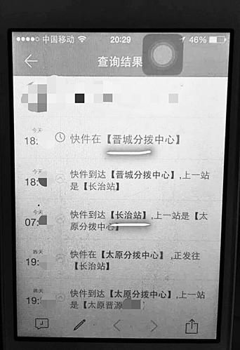 张女士说,前段时间,住在晋源的朋友要给住在长风街的她送套化妆品,两人一直对不上时间,朋友就给她发了个同城快递。“我觉得同城快递就算不是当天送到,最晚也第二天就能送到。可我等了又等一直没等到快递员的电话,后来朋友查了下快递单号,才发现快递竟然先去了长治,又去了晋城。”张女士说,好在快递在外漂流三天三夜后,她接到了快递员的电话,在仔细检查了快递包装,没有破损就签了字。