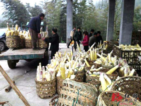 在松木塘镇的世林竹笋专业生产合作社,挖笋队伍将一筐筐春笋送到基地称重,满眼嫩黄,格外喜人。