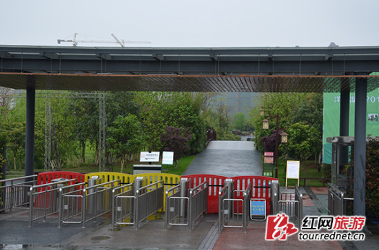 (长沙洋湖湿地公园的主入口,同样设置门禁系统。景区安保人员称,节假日等人流量大时,必须换取免费门票入门,“为了统计人数。”)