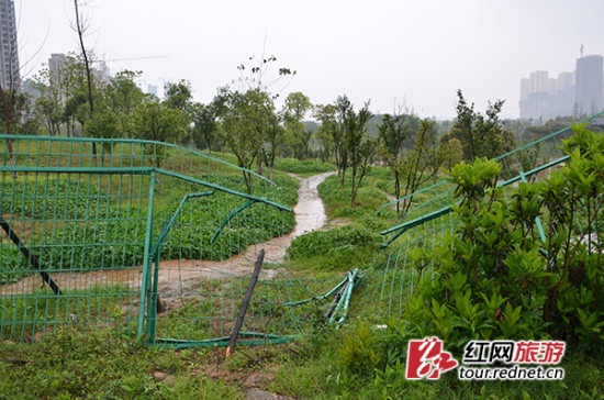 (在距离景区主入口不到100米处,坪塘大道上,景区一处围挡被破坏,甚至踩出了一条路。)