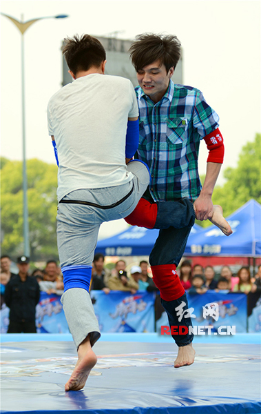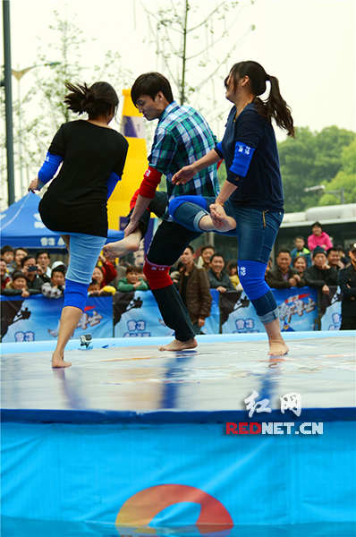 (女选手二人成一组,挑战身高一米八、PK战绩显著的男擂主。)红网长沙4月12日讯(时刻新闻记者 彭双林 通讯员 彭燕)单腿站立,双手抱住另一条腿,跳跃起来用膝盖攻击对方,这是童年最简单的游戏“斗鸡”。4月11日,由湖南都市频道首创的全国首档民间传统竞技节目《脚斗士》启动录制,包括健身教练、大学生以及黑人等在内的各路选手齐聚擂台,展开强劲PK,争夺超级脚斗士称号,赢IPAD甚至海南游等大奖。
