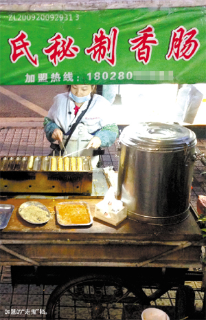 “走鬼”又玩新花样,有的竟打起了“加盟连锁”的旗号——在宝华路恒宝广场前摆档的香肠肉串“走鬼”档,推车上就支起“加盟”广告,还附上了“加盟热线”,声称只要3800元,就能“开档摆摊赚大钱”,还教你怎么应对、疏通城管。据说这样的加盟“走鬼”档在全市已经有17档,每个摊档生意好的话能日赚千元。