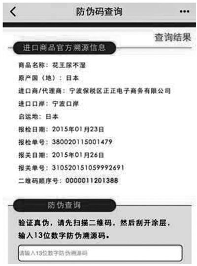 除了关注品牌、价格敏感以及物流便捷等因素外,消费者对母婴类商品最为关注的是商品品质的确定性。目前,通过保税区跨境物流模式的扫码溯源机制,天猫进口奶粉纸尿裤将获“身份证”。消费者在收到货品时,用手机天猫或手机淘宝客户端,扫描包装上的二维码后,由海关提供的原产地、进口商、口岸以及报关单号等官方溯源信息一目了然;同时消费者可以刮开二维码下防伪涂层,输入防伪码立刻验证真伪。