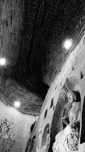 一处处石窟造像间,除了这些从北魏到隋唐的佛像,寺庙内最具有价值的便是悬蜗卧顶的建筑构造了。来到大殿后面的石窟廊屋间,迎崖的一面,是满壁的石刻造像,另一面则是留了门窗般孔洞的土壁。土壁上,一幅幅明代的壁画精美绝伦,有怀抱琵琶的乐者,有细观表演的佛教人物。土壁与磨崖间的顶部,便是举世无双的悬蜗卧顶。
