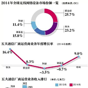 市场研究公司IDC的数据则显示,2014年,爱立信在全球无线网络设备市场占据25.7%的份额,排名第一;华为占据23.2%的份额,排名第二;诺基亚和阿朗的市场份额分别是15.8%和11.4%,排名位列第三和第四。以此计算,这两家公司合并之后,市场份额将达到27.2%,超过了爱立信和华为,位居无线设备市场第一。