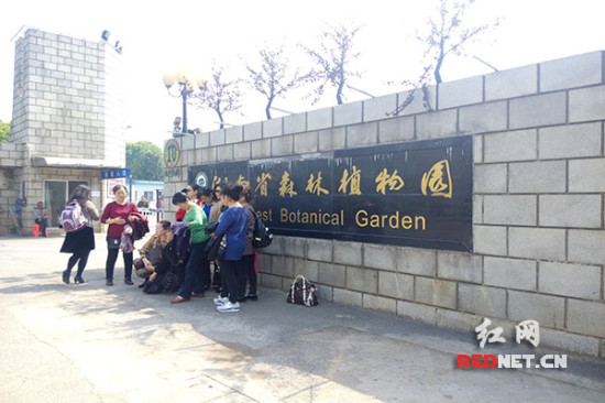(今日上午,游客们正在省植物园门前留影。)