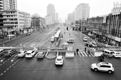 南内环街封闭路口,一些车辆停在路口