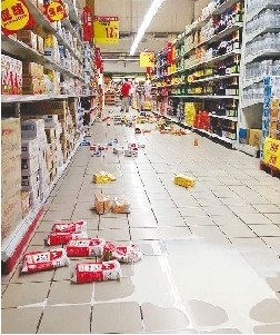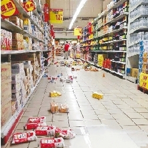 4月20日,台北市内湖大润发大卖场的商品从货架上震落。新华社发