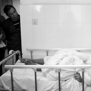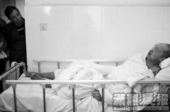 4月20日,省第二人民医院,53岁的朱某躺在病床上接受采访,隔壁病房的人忍不住过来看热闹。图/潇湘晨报记者 蒋丽梅
