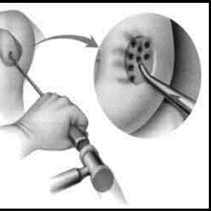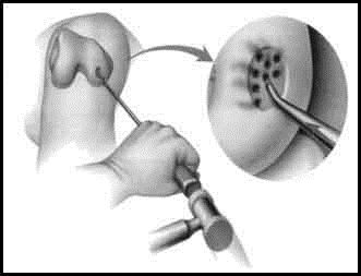 四周后,陈女士第二次被推进了手术室,这一次,医生要在缺损的软骨上建一个房子给软骨细胞住。医生先是在缺损部位的骨头上每隔4毫米钻出一个深4毫米的洞,让骨髓里干细胞、血浆等营养成分流淌出来,促进缺损软骨重新生长。