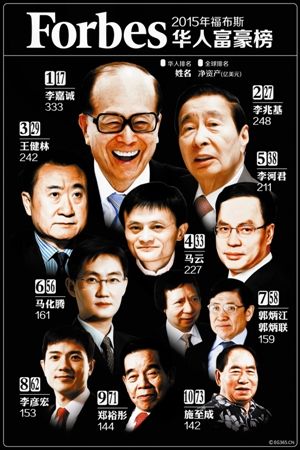 《福布斯》杂志中文版20日发布2015华人富豪榜。其中,李嘉诚以净资产规模333亿美元再次蝉联第一,这也是其连续17年雄踞榜首。