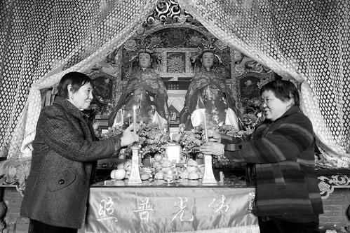 男人们身着盛装,起劲地敲起威风锣鼓,其余的人则一个个面带笑容,三三两两结伴进入大殿磕头上香祈福,社首们已经开始在英皇双凤殿内的姑姑神像前祭祀请香,然后绕行到唐尧故园内的尧王寝殿焚香辞行,并为代表吉祥的黄丝线、红绸带“开光”。
