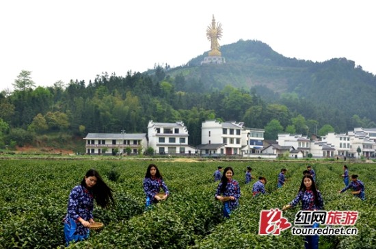 (游客们自助采茶的宁乡沩山温泉茶园,就在世界最大的千手观音下)