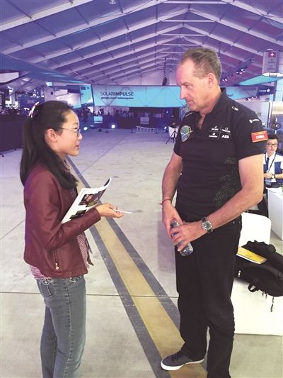 晨报小记者仲伟涵采访飞行员贝特朗·皮卡尔(左)和安德烈·波许博格(右)。