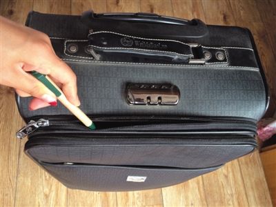 昨日,记者用一支圆珠笔轻松划开行李箱的拉链。新京报记者 李婷婷 摄