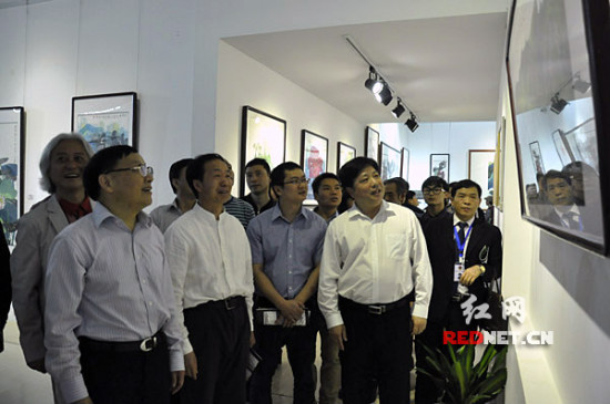 红网长沙4月28日讯(时刻新闻记者 刘玉先)今天上午,“彩墨大湘西·我的中国梦”毛光辉现代彩墨精品画展在长沙市博物馆开幕。湖南省政协副主席武吉海,省委宣传部副部长、省人民政府新闻办主任周湘等出席并观展。