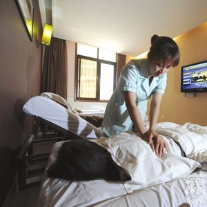 4月28日,长沙市双杨路,颐而康的技师正在给顾客做按摩。图/潇湘晨报记者 杨旭 实习生 杨杨