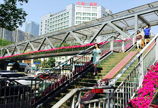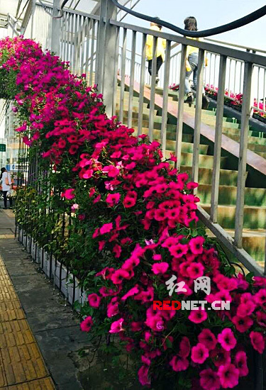 (桥的两边,姹紫嫣红。)红网长沙4月29日讯(时刻新闻记者 李慧芳 张珍)4月29日下午,营盘路长沙市一医院门口的天桥下,不少路过市民拿出手机对着天桥拍照:“这桥(花草)真好看,漂亮!”路过的朱先生在拍照后赞道:“景色好、心情好、秩序好,一下子感觉长沙好像提升了几个档次。”