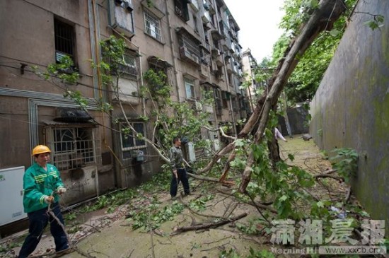 雨花区湖橡小区20栋与21栋之间,一棵二三十米高的悬铃木,因为扛不住前一天晚上的暴风骤雨,被拦腰吹断。树枝打落了小区21栋3楼屈娭毑家的空调挡雨棚。“我睡了,不知道什么时候刮倒的。”屈娭毑说。