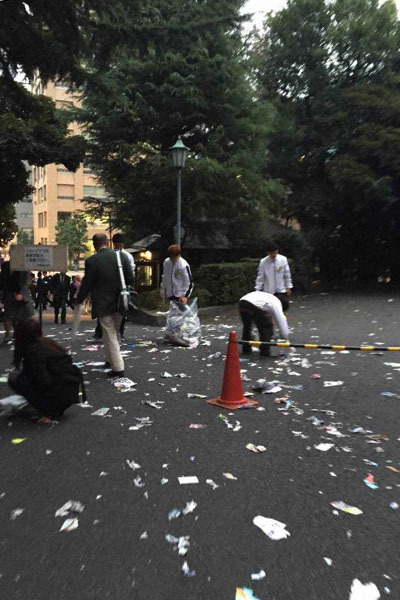 (乱丢垃圾国外也有,旅居日本的张剑波拍下日本某学校活动后的场景,相关人员在清理现场。)