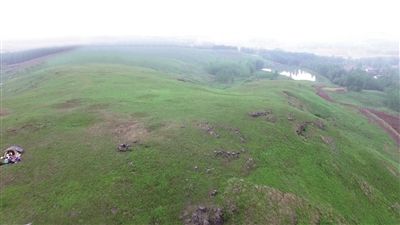 记者探访:航拍画面显示,这里的几个山头占地两三千亩,的确地势开阔、绿草如茵,没有一棵树木,而山脚下的这个小水库和小树林则起到了点缀作用。
