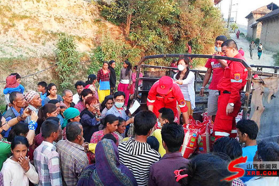 山西天龙救援队队员在尼泊尔为灾民发放物资