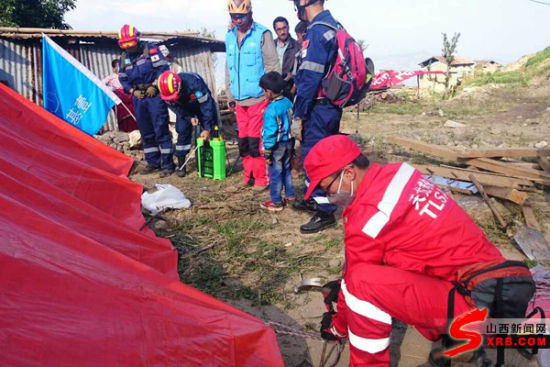 山西天龙救援队队员在尼泊尔为灾民搭帐篷