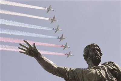 3、苏-25战机在彩排中飞过红场。